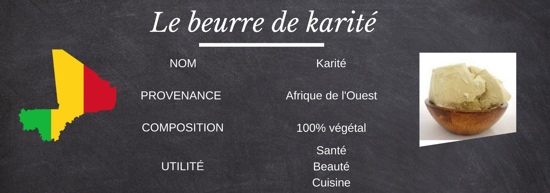 Dans toute la région ouest-africaine, le Karité est LE produit indispensable de maison. Produit localement, ce beurre est extrait d'une noix. Son odeur est assez forte et agréable (selon les goûts de chacun). Si vous n'aimez pas l'odeur, prenez un beurre parfumé (article à venir) ou faites le fondre et ajoutez-y du citron pour couper l'odeur !